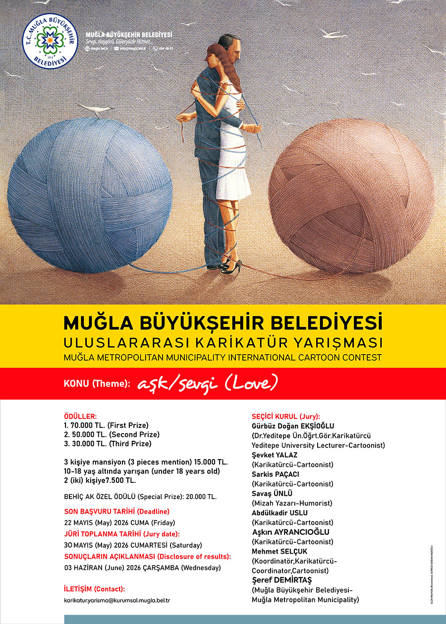 Muğla Büyükşehir Belediyesi, bu yıl 6’ncısını düzenlediği Uluslararası Karikatür Yarışması ile sanatçıları buluşturuyor. “Aşk/Sevgi” temasıyla gerçekleştirilecek yarışma, dünyanın dört bir yanından amatör ve profesyonel karikatürcülerin katılımına açık olacak.