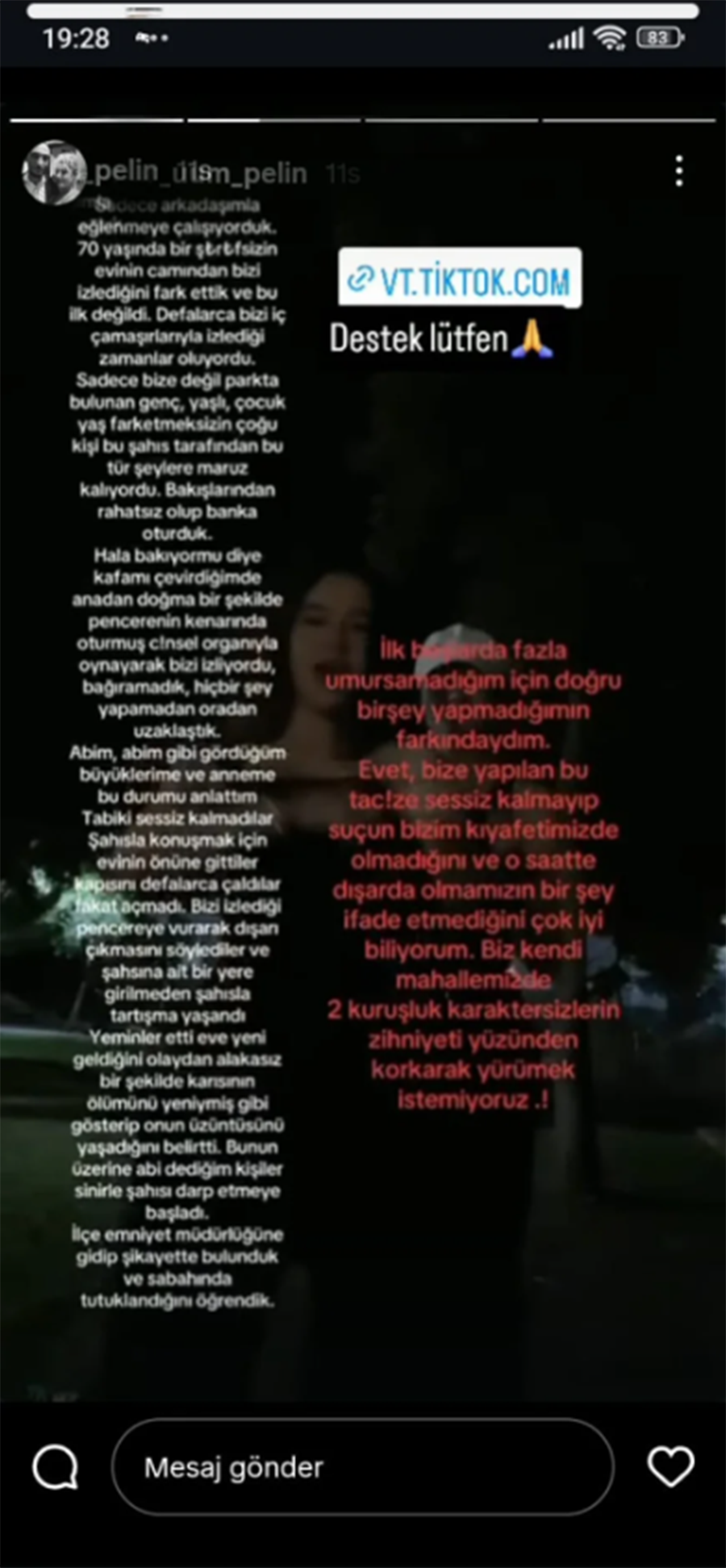 Mahalleli sosyal medyadan açıklama yaptı: ”Parkta sadece arkadaşlarla eğlenmeye çalışıyorduk. 70 yaşında bir sapık tacizin failinin ablamın bizi izlediğini fark ettik ve bu ilk kez değildi. Defalarca bizi taciz amaçlarıyla izlediği zamanlar oluyordu. Sapık, bizi daha parkta bulunan genç, yaşlı, çocuk yaş farketmeksizin çoğu kişiyi bu parkın içerisinde bu tür şeylere maruz kalıyordu. Ablamda bende çok korkmuştum.