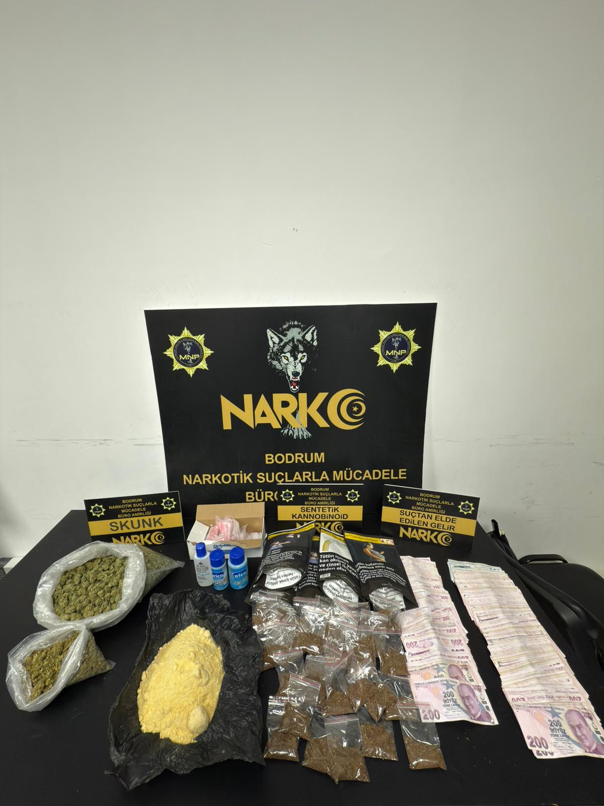 Muğla İl Emniyet Müdürlüğü Narkotik Suçlarla Mücadele Şube Müdürlüğü ekiplerince, uyuşturucu madde ticaretinin önlenmesine yönelik yürütülen çalışmalar kapsamında Bodrum ilçesinde bir otel odasına operasyon düzenlendi.