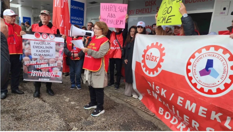 DİSK Dev Emekli-Sen Bodrum Şubesi’nin Eski Otogar’daki ofisi düzenlenen eylem ve basın açıklamasına katılanlar ellerinde “Kahrolsun Amerikan Emperyalizmi”, “Yankee Go Home” yazılı pankartlar açıp sloganlar attılar.