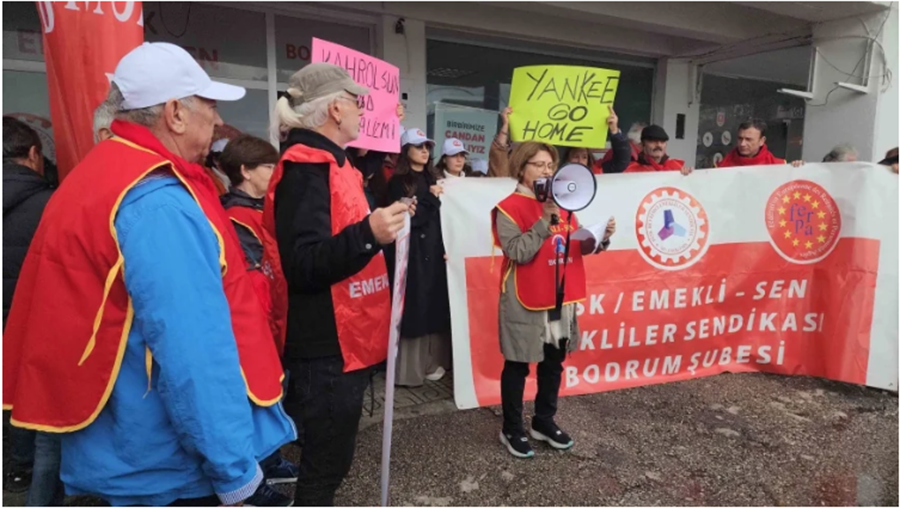 DİSK Dev Emekli-Sen Bodrum Şubesi’nin Eski Otogar’daki ofisi düzenlenen eylem ve basın açıklamasına katılanlar ellerinde “Kahrolsun Amerikan Emperyalizmi”, “Yankee Go Home” yazılı pankartlar açıp sloganlar attılar.