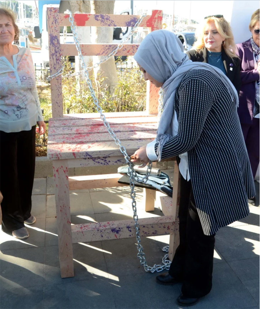 Bodrum’daki Belediye Meydanı’nda bugün kadına yönelik şiddeti protesto eden kadınlar temsili olarak meydana getirdikleri ve zincirlenmiş dev sandalyenin zincirlerini kırdılar, kadına şiddete sert tepki gösterdiler.