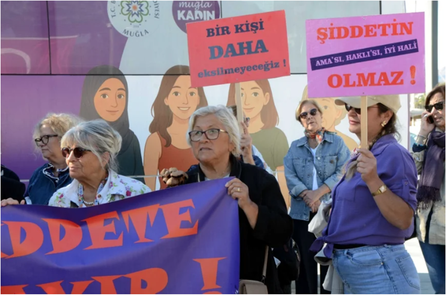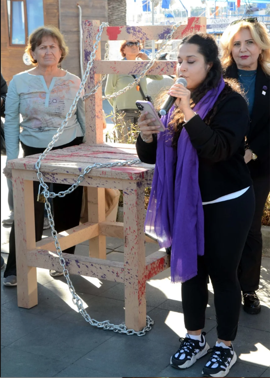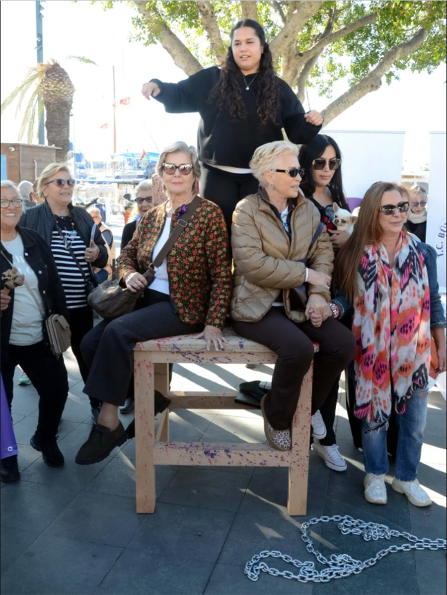 Bodrum Kent Konseyi Kadın Meclisi üyesi kadınlar ve Bodrumlu kadınlar öğle saatlerinde belediye meydanında buluştu.. Meydana yalnızlaştırılmış kadınları temsil eden ve zincirlerle bağlanmış dev sandalye getiren kadınlar sık sık Kadınlar Birlikte Birlikte Güçlü, Susmuyoruz, Korkmuyoruz, İtaat Etmiyoruz, Şiddete Karşı ses Çıkar sloganları attı, düdüklerle meydanı inletti.