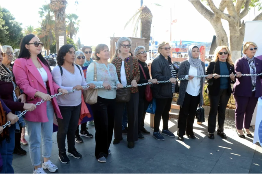 Bodrum Kent Konseyi Kadın Meclisi üyesi kadınlar ve Bodrumlu kadınlar öğle saatlerinde belediye meydanında buluştu.. Meydana yalnızlaştırılmış kadınları temsil eden ve zincirlerle bağlanmış dev sandalye getiren kadınlar sık sık Kadınlar Birlikte Birlikte Güçlü, Susmuyoruz, Korkmuyoruz, İtaat Etmiyoruz, Şiddete Karşı ses Çıkar sloganları attı, düdüklerle meydanı inletti.
