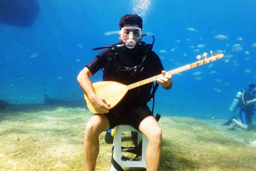 Fethiye’de denizin 5 metre derinliğine dalış eğitmeni Önder Diktaş ile birlikte dalış yapan, Türk Halk Müziği sanatçısı Yunus Koşar saz çalıp ’Halime Kız’ olarak bilinen Neşet Ertaş türküsünü seslendirdi.