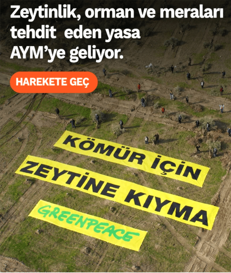 Milas’a bağlı İkizköy Mahallesi Akbelen Mevkii’nde zeytinliklerin sökülmesiyle başlatılan tartışmalar, 7554 sayılı Bazı Kanunlarda Değişiklik Yapılmasına Dair Kanun’un iptali talebini yeniden gündeme taşıdı. Greenpeace Türkiye, söz konusu kanunun Anayasanın çevre hakkına güvence altına alan maddelerini ihlal ettiği gerekçesiyle Anayasa Mahkemesi’ne gönderilecek e-posta kampanyası başlattı.
