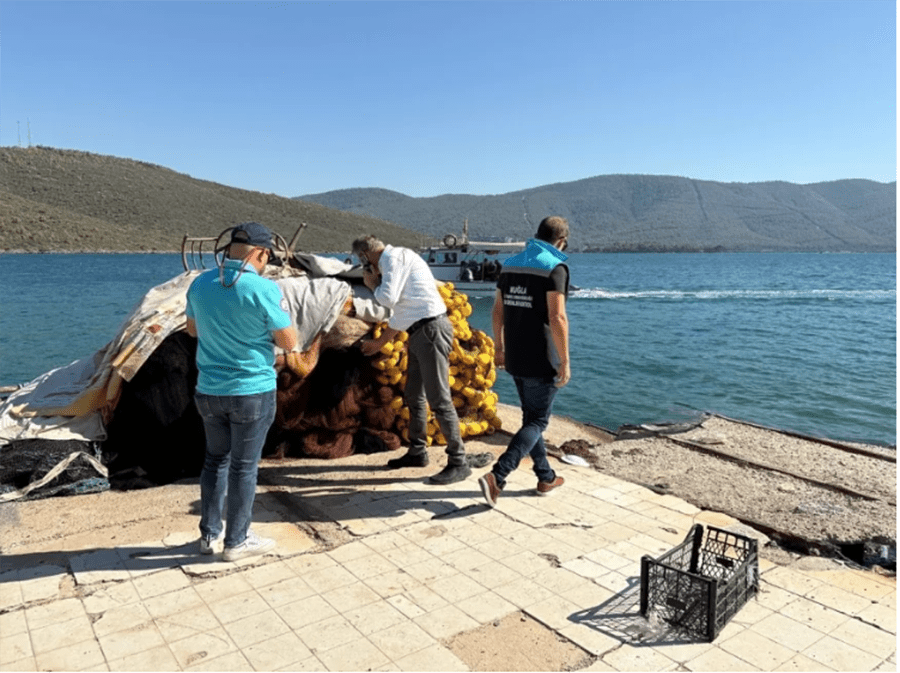 Yapılan ihbarları değerlendiren Balıkçılık ve Su Ürünleri Şubesi görevlileri yaptıkları iki günlük denetim sırasında üzerindeki balıklardan ve ıslaklığından aynı gün kullanıldığı tespit edilen, markasız ve yasal ölçülere uymayan (21 mm göz açıklığı, 38 kulaç derinlik, 360 m uzunlukta), ancak sahibi belirlenemeyen 1 adet alamana ağı ile denizde üretim yapan su ürünleri yetiştiricilik tesislerine ait kafeslerin dibine bırakılmış halde bulunan 4 adet markasız uzatma ağına el koydu.