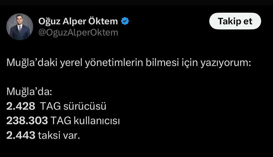 Martı İleri Teknoloji’nin kurucusu Oğuz Alper Öktem, Muğla’daki TAG kullanımına ilişkin verileri sosyal medya platformu X üzerinden paylaştı. Açıklanan rakamlar, kentteki ulaşım tartışmalarını yeniden gündeme taşıdı.