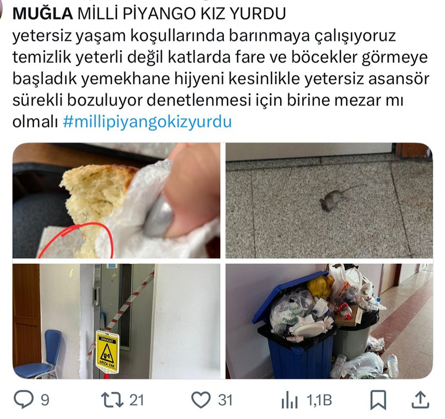Bir öğrencinin sosyal medya üzerinden yaptığı paylaşıma göre, Muğla Milli Piyango Kız Öğrenci Yurdu’nda temizlik ve yemek hijyeni konusunda sorunlar yaşanıyor.