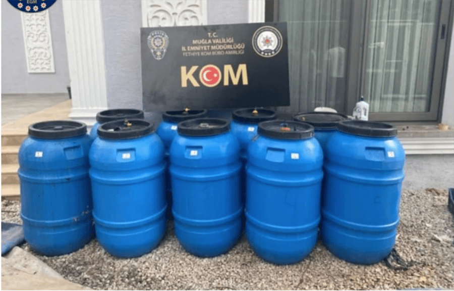 Muğla’nın Fethiye ilçesinde kaçak ve sahte içki üretimine yönelik gerçekleştirilen operasyon kapsamında büyük miktarda etil alkol ve sahte şarap bulundu.
