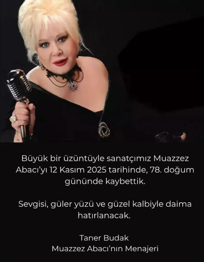 Budak mesajında, “Büyük bir üzüntüyle Sanatçımız Muazzez Abacı’yı 12 Kasım 2025 tarihinde 78. doğum gününde kaybettik. Sevgisi, güler yüzü ve kalbiyle daima hatırlanacak” ifadelerini kullandı.