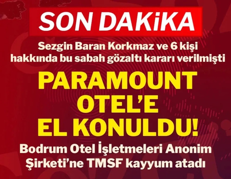 TMSF, Bodrum Otel İşletmeleri Anonim Şirketine (Paramount Otel) kayyum olarak atandı. Sezgin Baran Korkmaz ve 6 kişi hakkında bu sabah gözaltı kararı verilmişti.