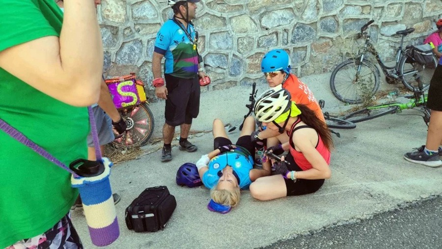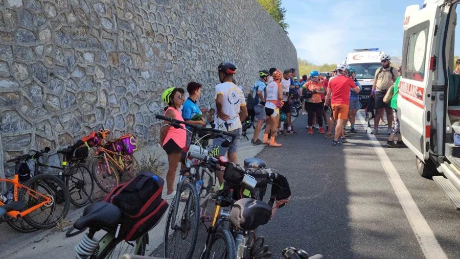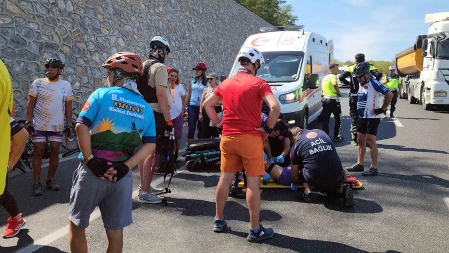 Muğla’da 25-28 Eylül tarihleri arasında düzenlenen 8. Uluslararası Mor Pedal Bisiklet Festivali’ne katılan yaklaşık 100 bisikletçi Yatağan ilçesindeki Stronikeila antik kentini ziyaret ettikten sonra dönüş yolunda yokuş aşağı inerken bilinmeyen bir nedenle kaza meydana geldi.