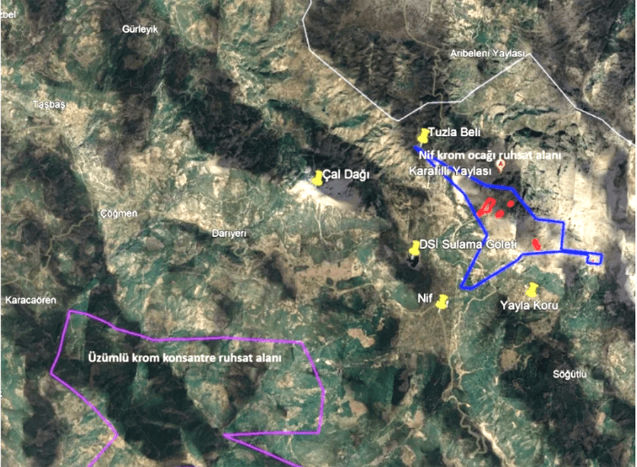 Proje dosyasına göre, krom madeni 836,77 hektarlık ruhsat sahasının 21,48 hektarlık bölümünde planlanıyor. Alan tamamen orman vasfındaki bölgede yer alıyor. Maden sahasının çevresinde Nif Çeşmesi’nin kaynağı, Üzümlü Havzası ve Yayla Koru su sistemleri bulunuyor. Projede patlatmalı açık işletme ve yeraltı üretimi planlandı. Yıllık toplam üretim kapasitesi ise 300 bin ton olarak belirtildi.
